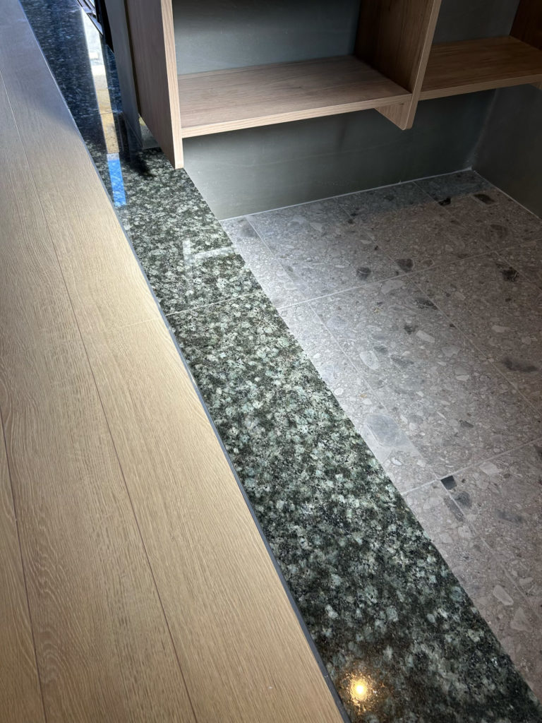 土間は 天然石:チェッポ・ディ・グレを採用しました。