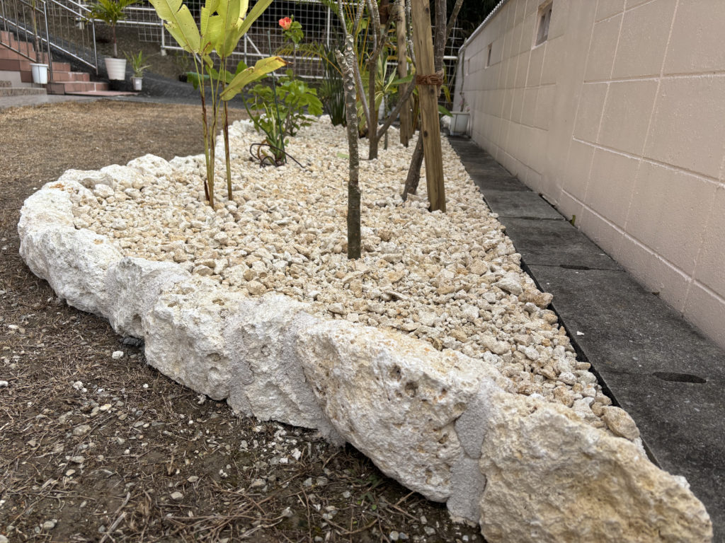沖縄県内の戸建て住宅にて、お庭の花壇まわりを琉球石灰岩で仕上げた外構工事(花壇造形)のご紹介です。