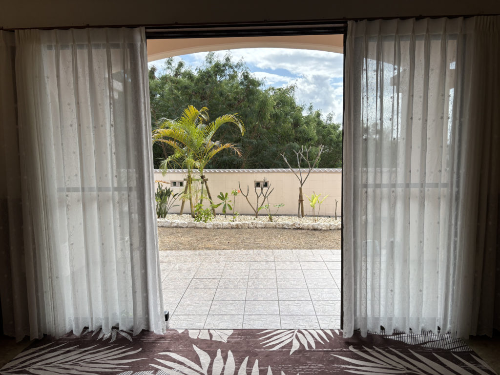 リビングから見たときに美しくまとまる景色になるよう造園屋さんが植栽を配置🌴🌺