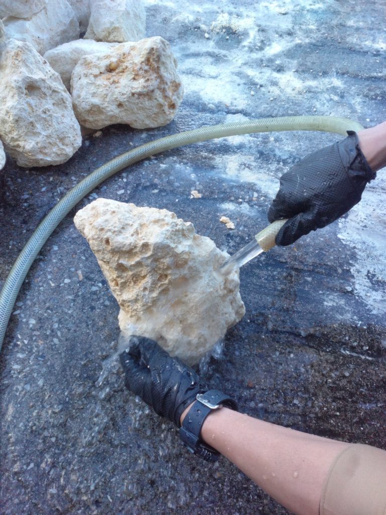 琉球石灰岩本来のやわらかい表情を引き出すため、丁寧に洗浄してから施工しています。